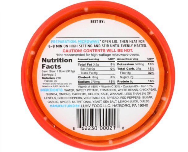 INGREDIENTS: Energy Stew: Sweet potato, tomatoes, white beans, organic chickpeas, quinoa, onions, tomatoes, carrots, kale, wakame, celery, and lentils. Less than 2% of green peppers, vegetable oil spread, red peppers, sugar, garlic, spices, nutritional yeast, sea salt, lemon juice, dulse.